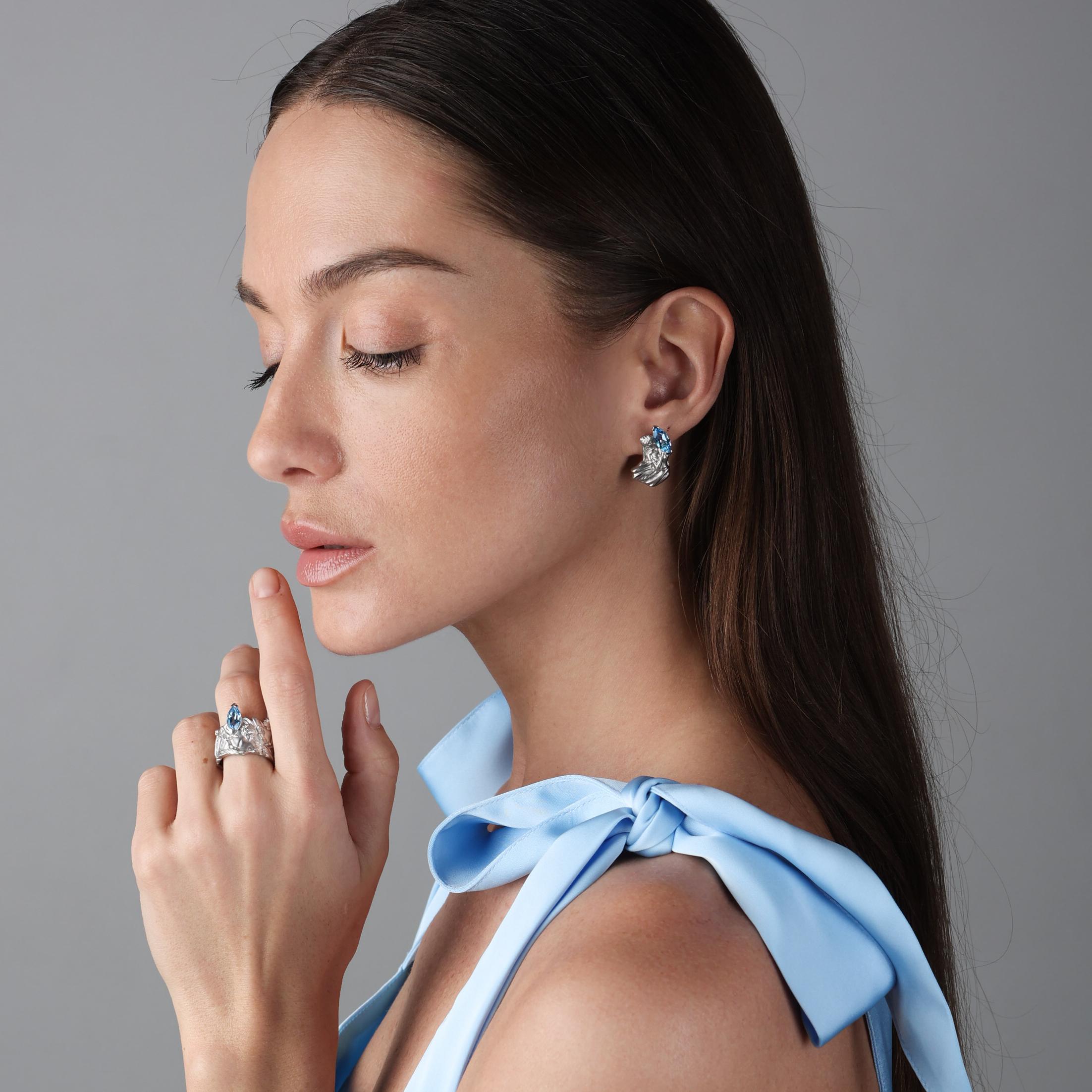 В центре внимания - образ прекрасной балерины на фоне вертикальных линий пастели, любимой техники Дега. В воздушных серьгах с небесно-голубым топазом заключена плавность трепещущего света, игра и пластика движения. Крупные голубые мазки камней придают нежным фигурам изысканность, а английский замок в виде застывшей в полете ткани завершает целостный образ танца.
